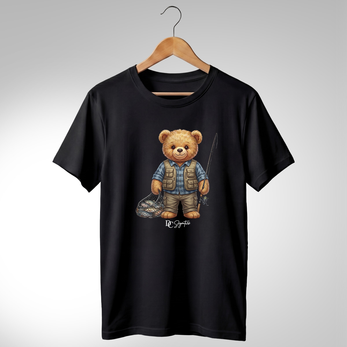 Tricou cu print detaliat ce prezintă un ursuleț masculin în rol de pescar, cu undiță și plasă cu pește, într-o scenă relaxată de outdoor. Designul este prietenos și expresiv, potrivit pentru ținute casual sau cadou pentru pasionații de pescuit.