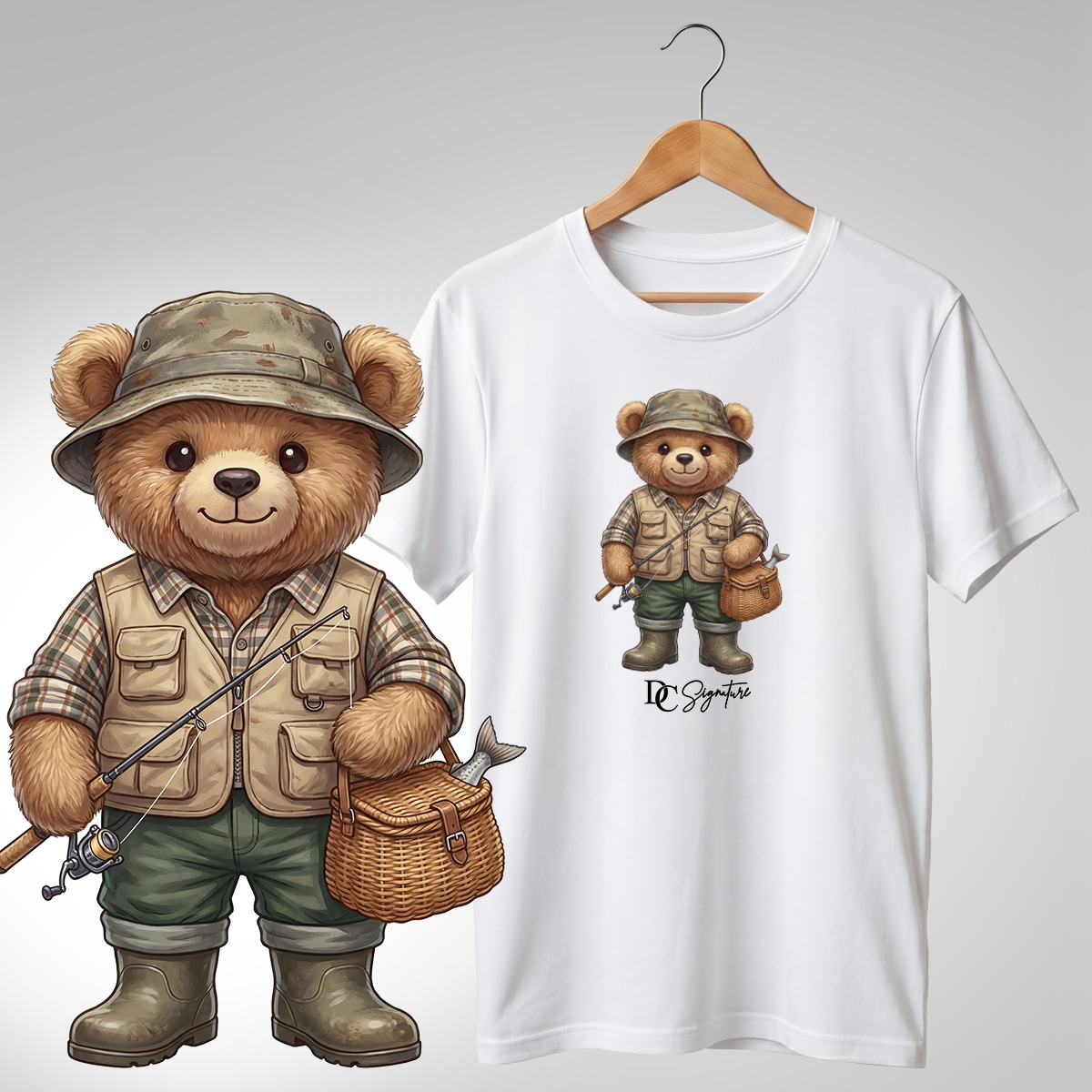 Tricou cu print detaliat ce prezintă un ursuleț masculin pescar, cu undiță și coș de pescuit cu pește. Designul are un aer relaxat și autentic, ideal pentru ținute casual, ieșiri la apă sau cadou pentru pasionații de pescuit.