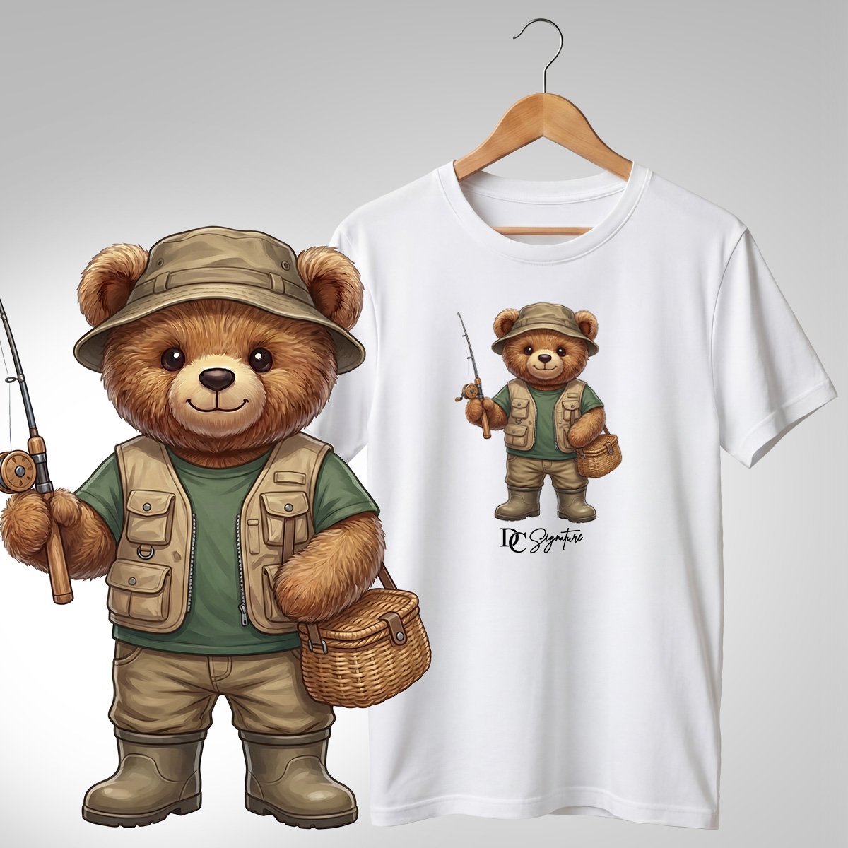 Tricou cu print detaliat ce prezintă un ursuleț masculin în rol de pescar, cu undiță scurtă și coș de pescuit, într-o ținută practică de teren. Designul este prietenos și echilibrat, potrivit pentru ținute casual, ieșiri în natură sau cadou pentru pasionații de pescuit.