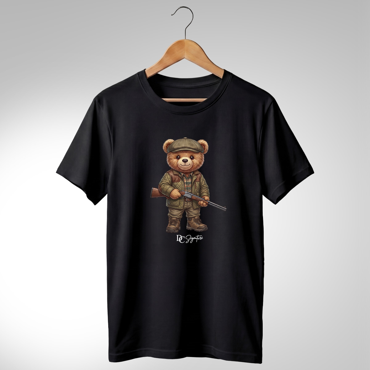 Tricou cu print detaliat ce prezintă un ursuleț masculin în rol de vânător, îmbrăcat în ținută de teren și ținând o armă de vânătoare. Designul are un aer rustic și aventuros, potrivit pentru ținute casual și pentru cadouri cu tematică outdoor.